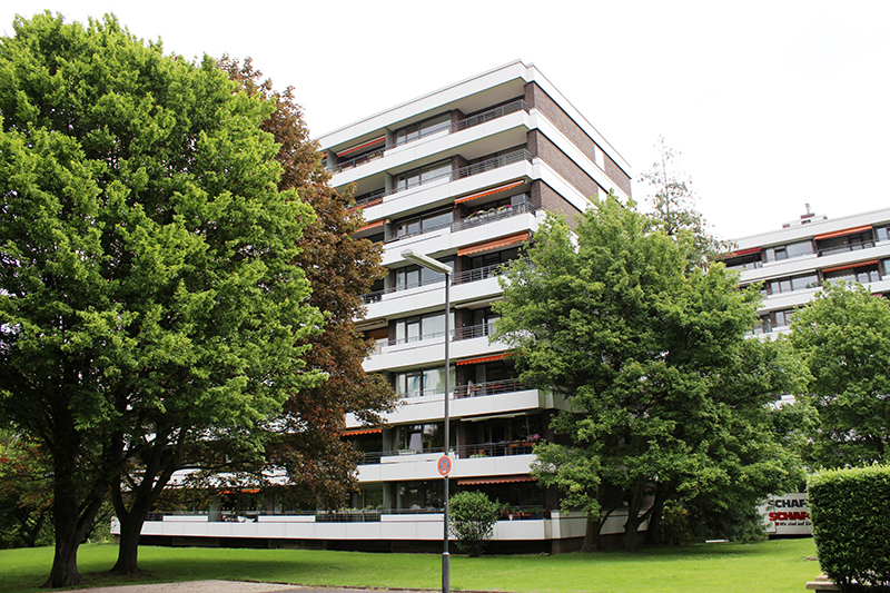Ende der 60er Jahre wurden hier drei große Wohnhäuser gebaut, die mit ihren 8 Etagen weit über die Rheinwiesen zu sehen sind. Anspruchsvoll geplant bieten die Objekte viel Komfort: eine repräsentative Eingangshalle, Tiefgarage, Lift, einen Hausmeisterservice, Waschräume, Fahrradkeller, ein weitläufiges, gärtnerisch gepflegtes Grundstück, eine angenehme Nachbarschaft und ein gemeinsames Schwimmbad.