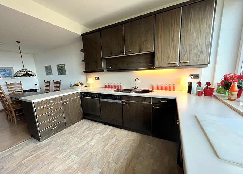 eine großzügige Küche mit spektakulärem Blick und offen angegliedertem Essplatz, der Platz auch für die große Familie bietet