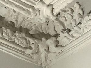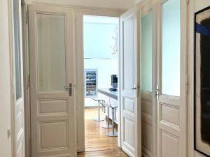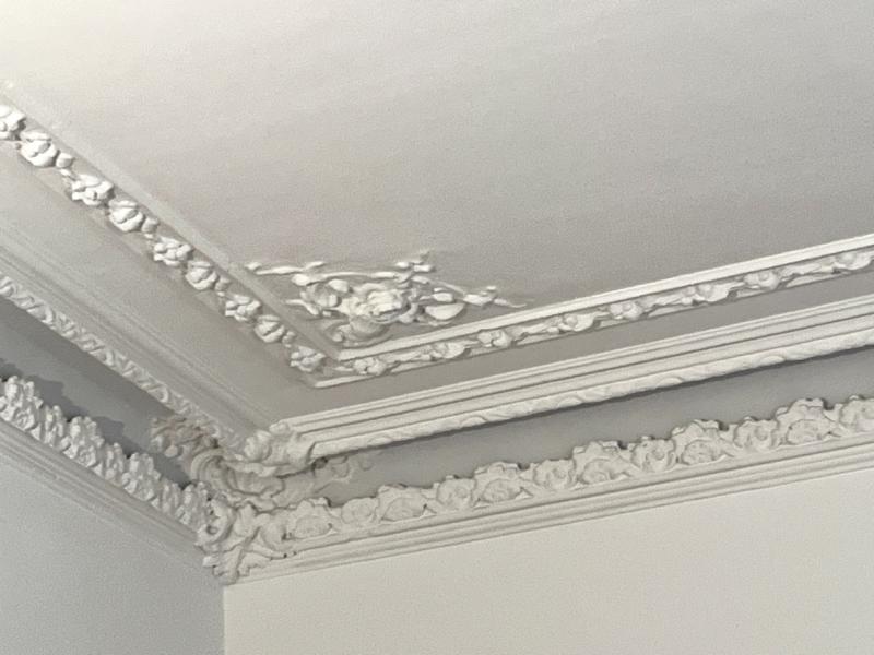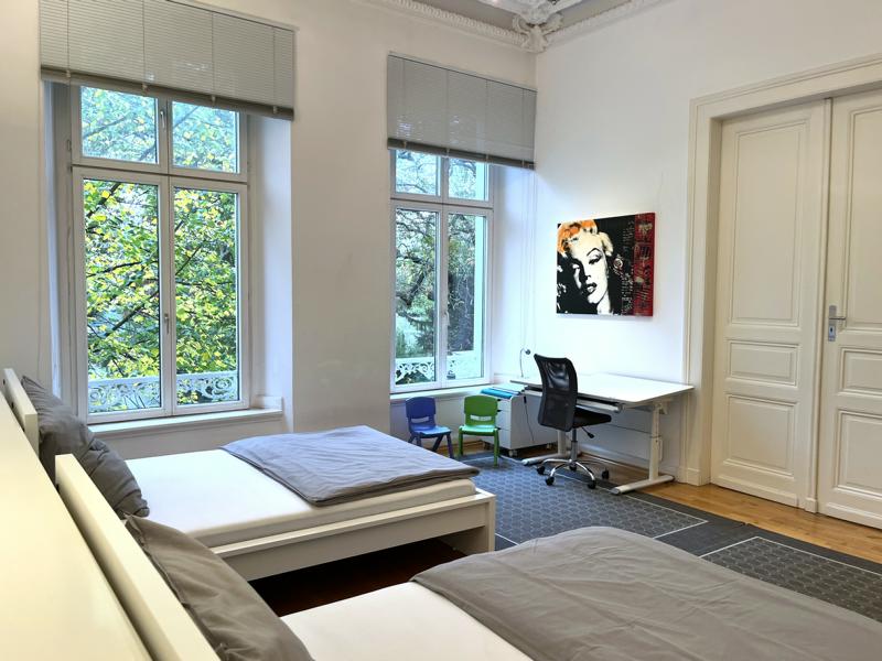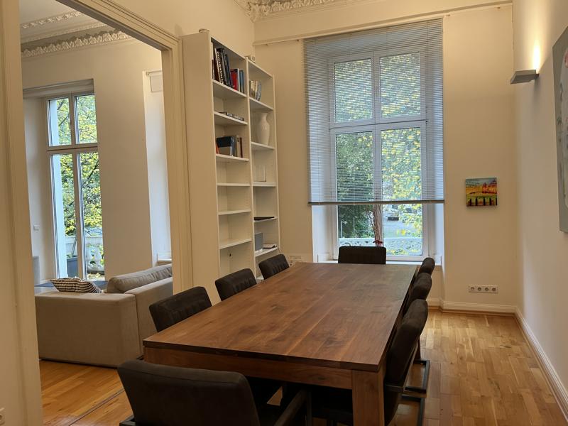 Altbau-Atmosphäre mit hohen Decken, Stuck an der Decke, großen Fenstern, Flügeltüren und schönem Parkett