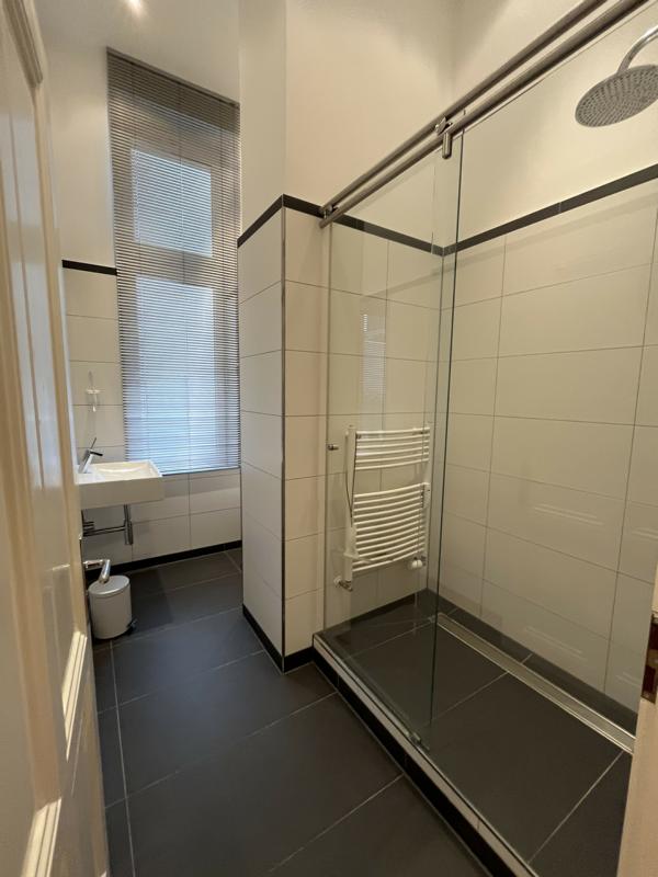 Das riesige Masterbad macht einfach Freude. Hohe Altbaufenster, die frei im Raum stehende Wanne und die raffinierte Abtrennung des raumbreiten Duschbereichs: das beste Umfeld um gut in den Tag zu starten.
